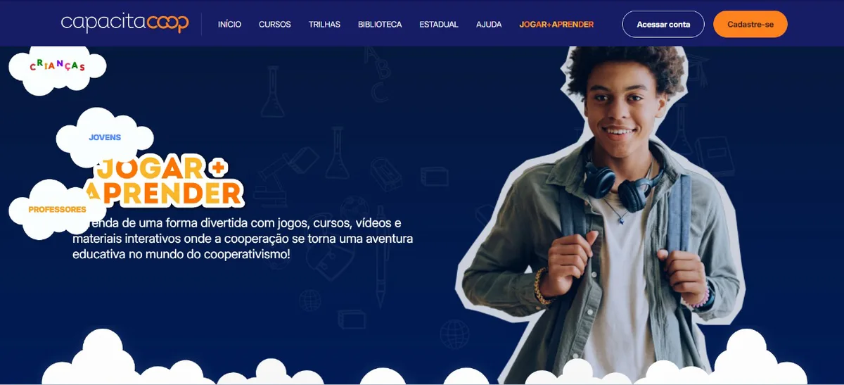 Acesse agora o ambiente Jogar+Aprender na plataforma CapacitaCoop e faça parte dessa jornada divertida de descobertas, crescimento e aprendizagem sobre a cultura cooperativista.